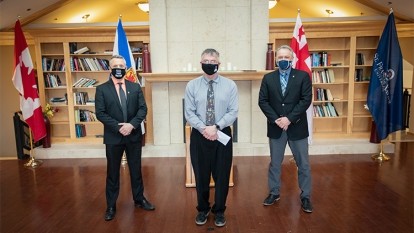 Dr. Gerry Marangoni (centre) at the announcement, with StFX Academic Vice-President and Provost Dr. Kevin Wamsley (left) and StFX President Dr. Andy Hakin